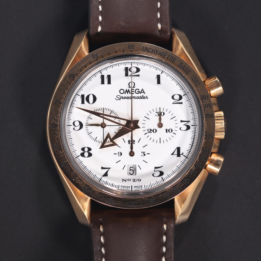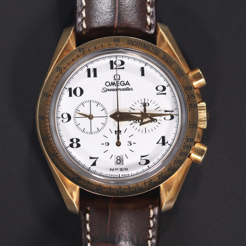 A extremely rare set of three 18kt gold Speedmasters, with enamel dials. This set was made in nine sets, and this is no 2 in the series.